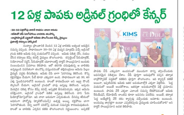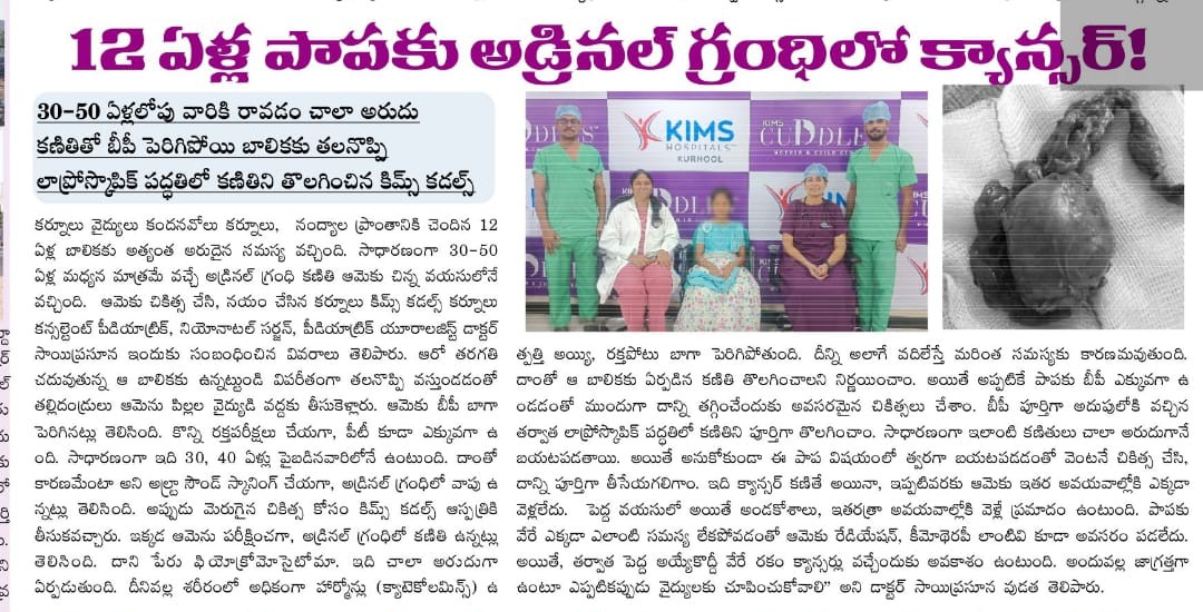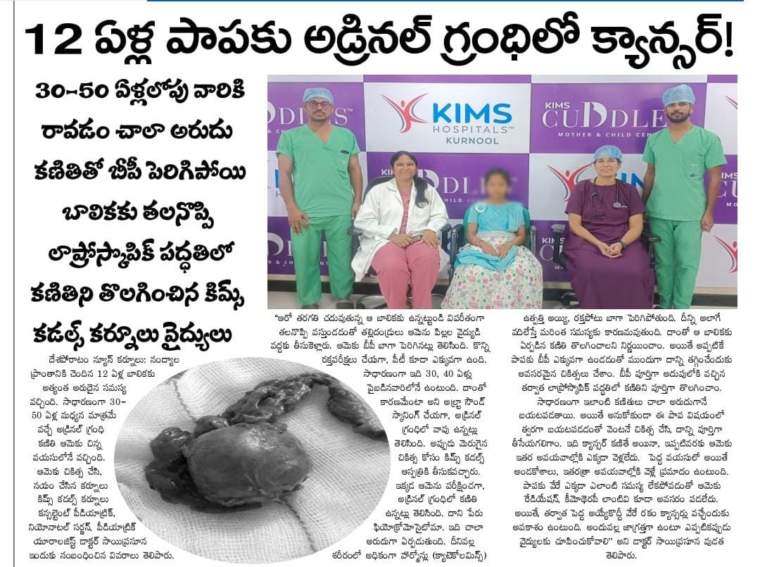 An ultrasound revealed a rare adrenal gland tumor ā a condition usually seen in adults aged 30ā40. After carefully stabilising her blood pressure, the surgical team removed the tumor using an advanced laparoscopic procedure.