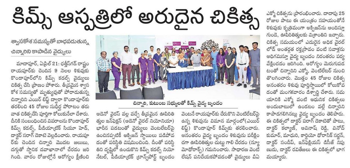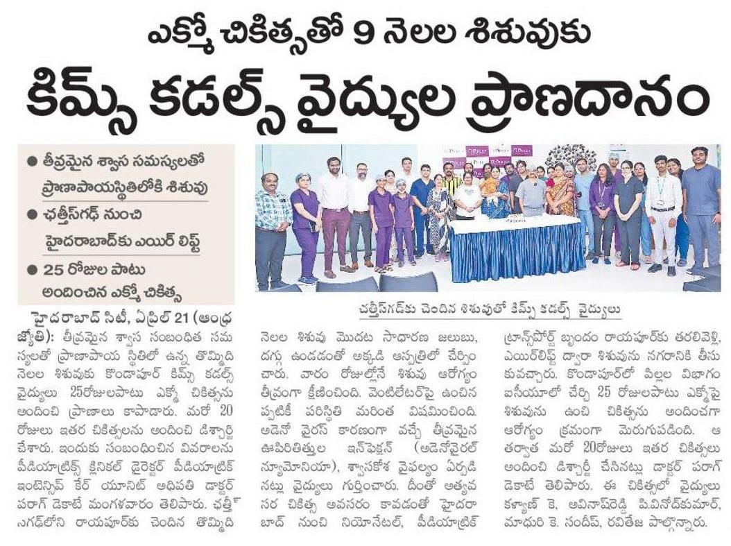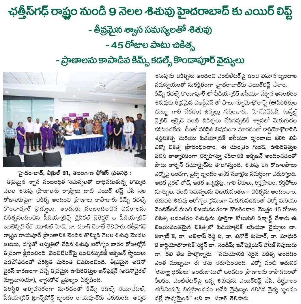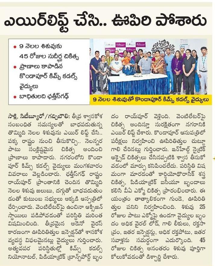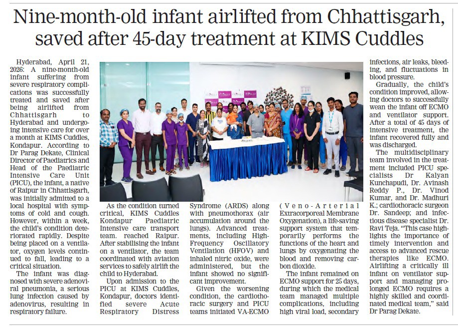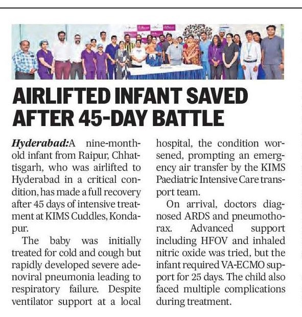 Doctors at KIMS Cuddles, Kondapur saved a 9-month-old infant with severe respiratory failure after being airlifted from Chhattisgarh in a critical condition.