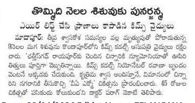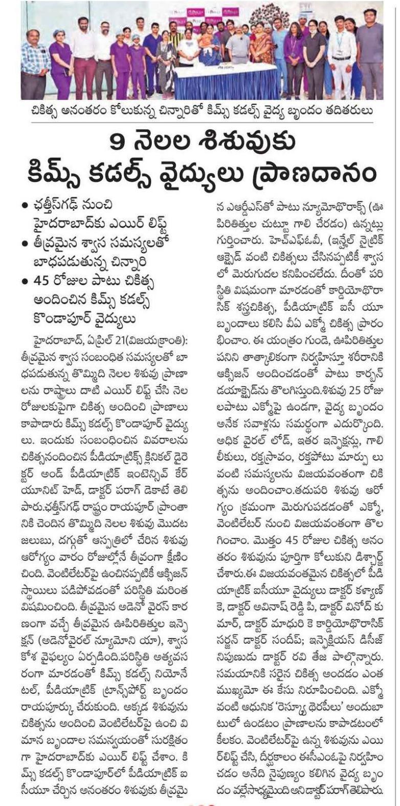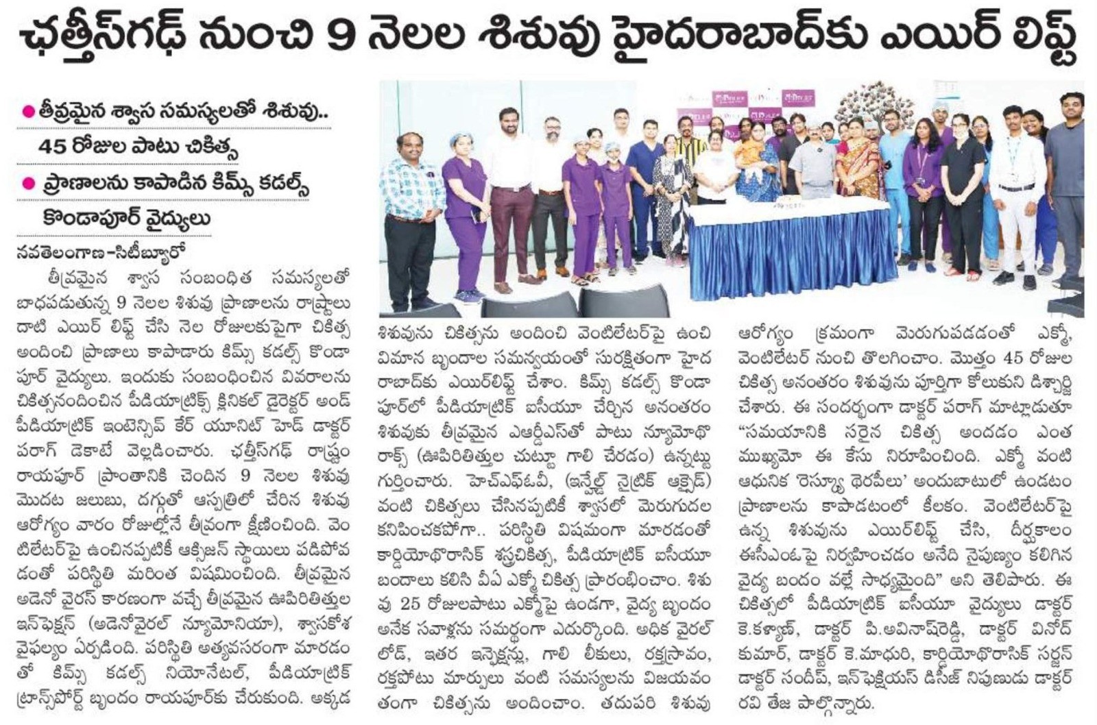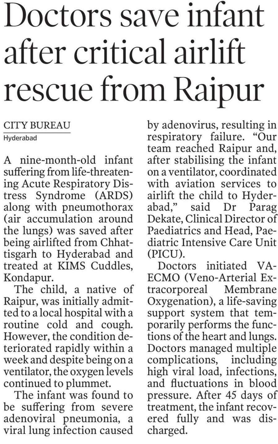 Doctors at KIMS Cuddles, Kondapur saved a 9-month-old infant with severe respiratory failure after being airlifted from Chhattisgarh in a critical condition.