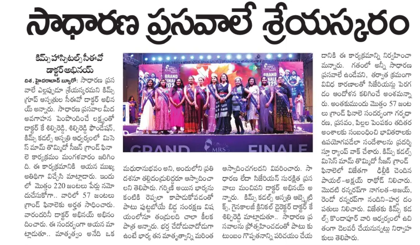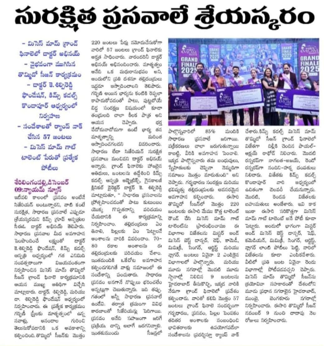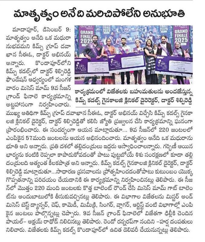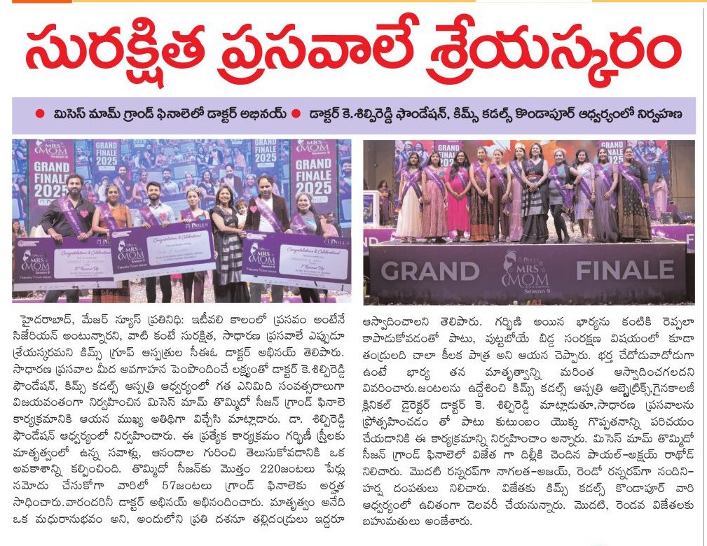 At the Grand Finale of Mrs. Mom Season 9, hosted by Dr. K. Shilpi Reddy, Clinical Director – Obstetrics & Gynaecology at KIMS Cuddles, Kondapur, the event highlighted awareness about natural birthing and the role of families in supporting mothers.