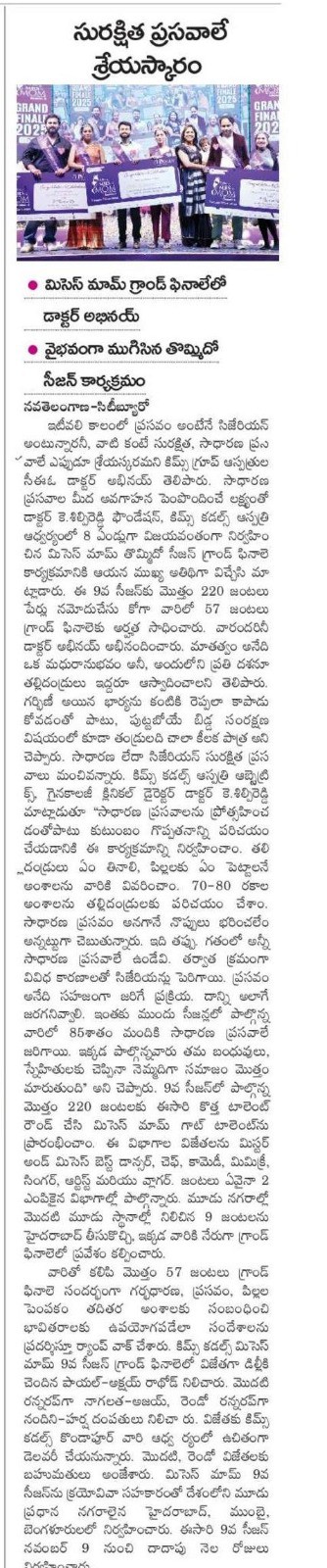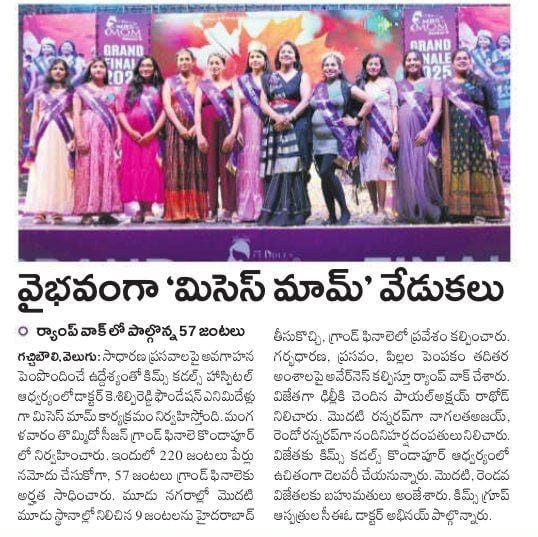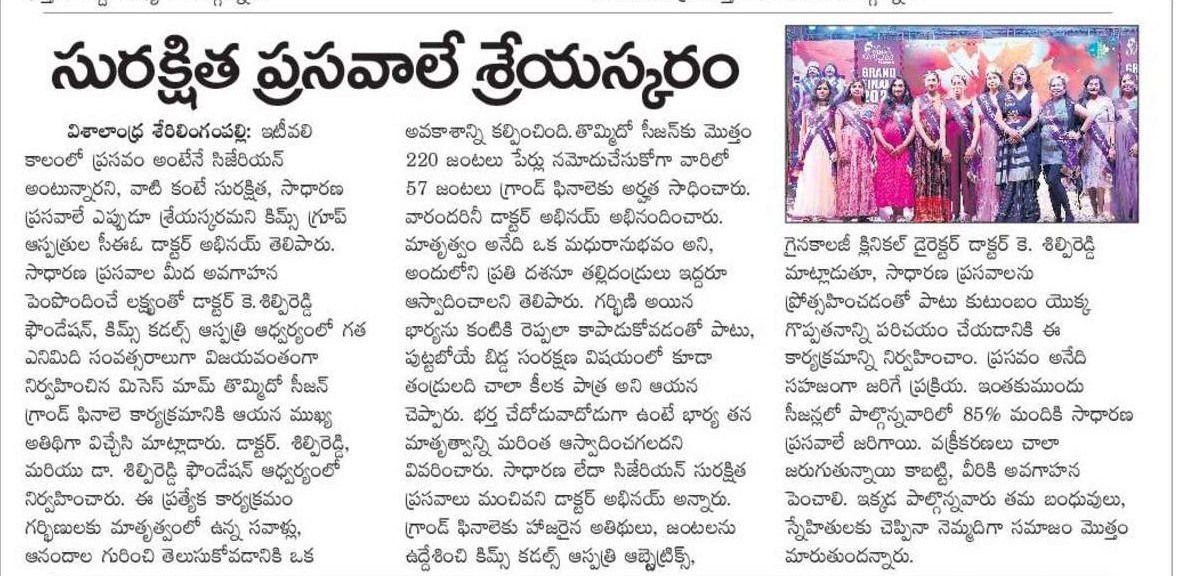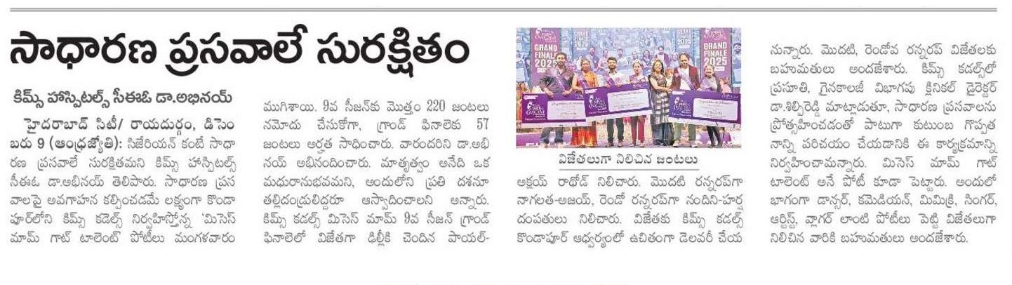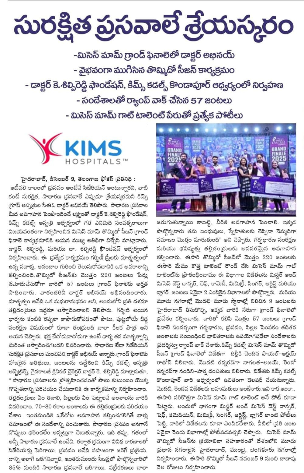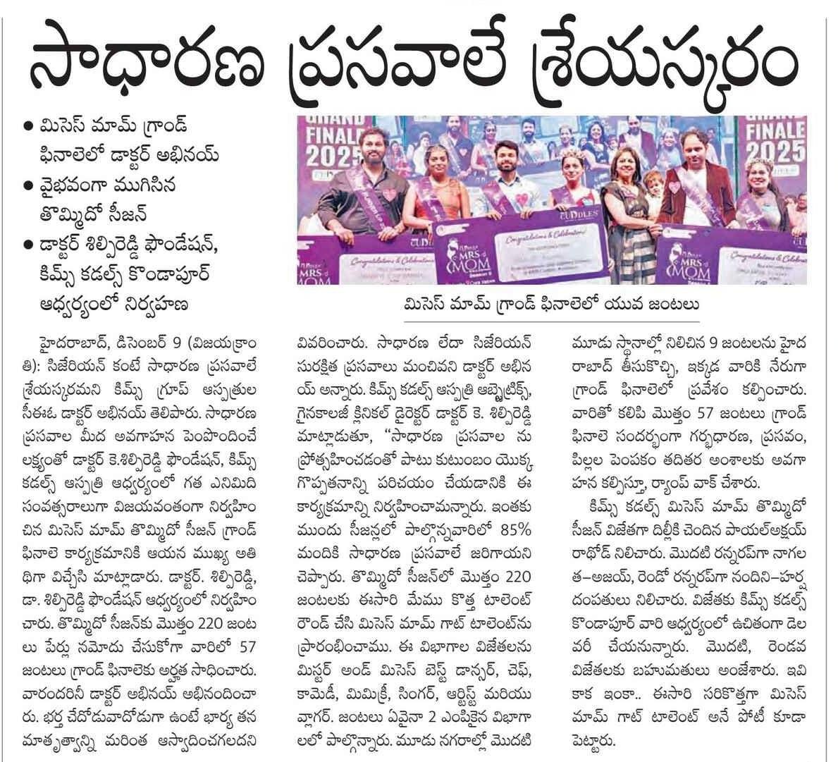 At the Grand Finale of Mrs. Mom Season 9, hosted by Dr. K. Shilpi Reddy, Clinical Director – Obstetrics & Gynaecology at KIMS Cuddles, Kondapur, the event highlighted awareness about natural birthing and the role of families in supporting mothers.