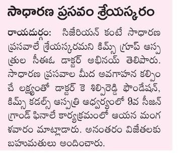 Chief Guest Dr. Abhinay, CEO of KIMS Hospitals, emphasized that normal deliveries are always better when possible. He reminded that with the right support—especially from fathers—a mother can enjoy her journey more meaningfully.