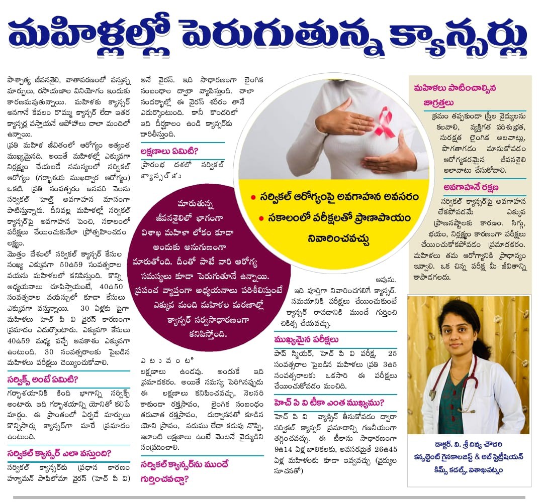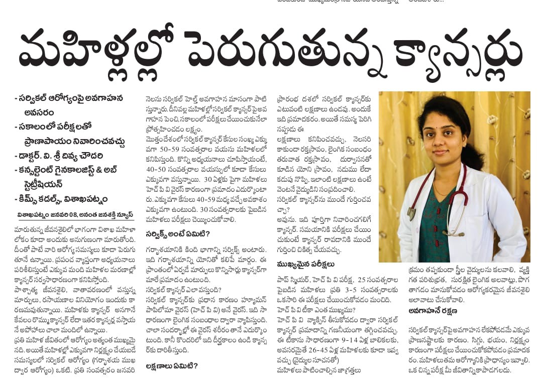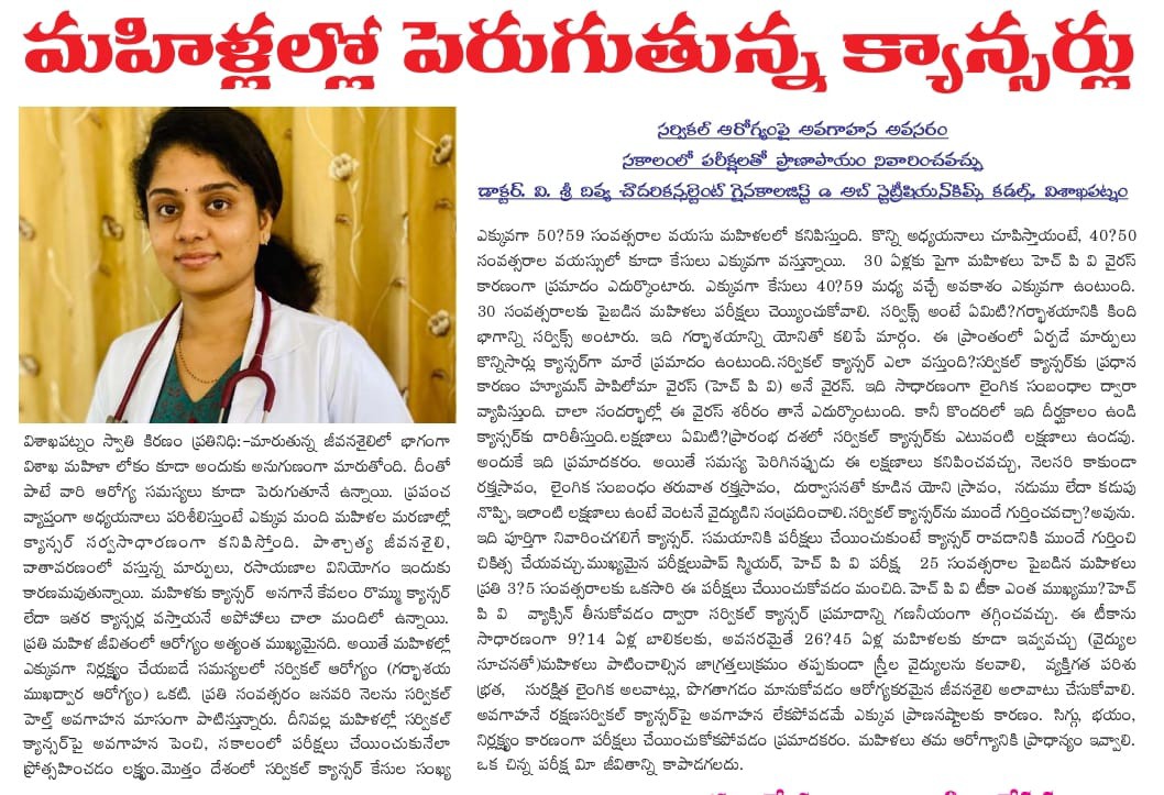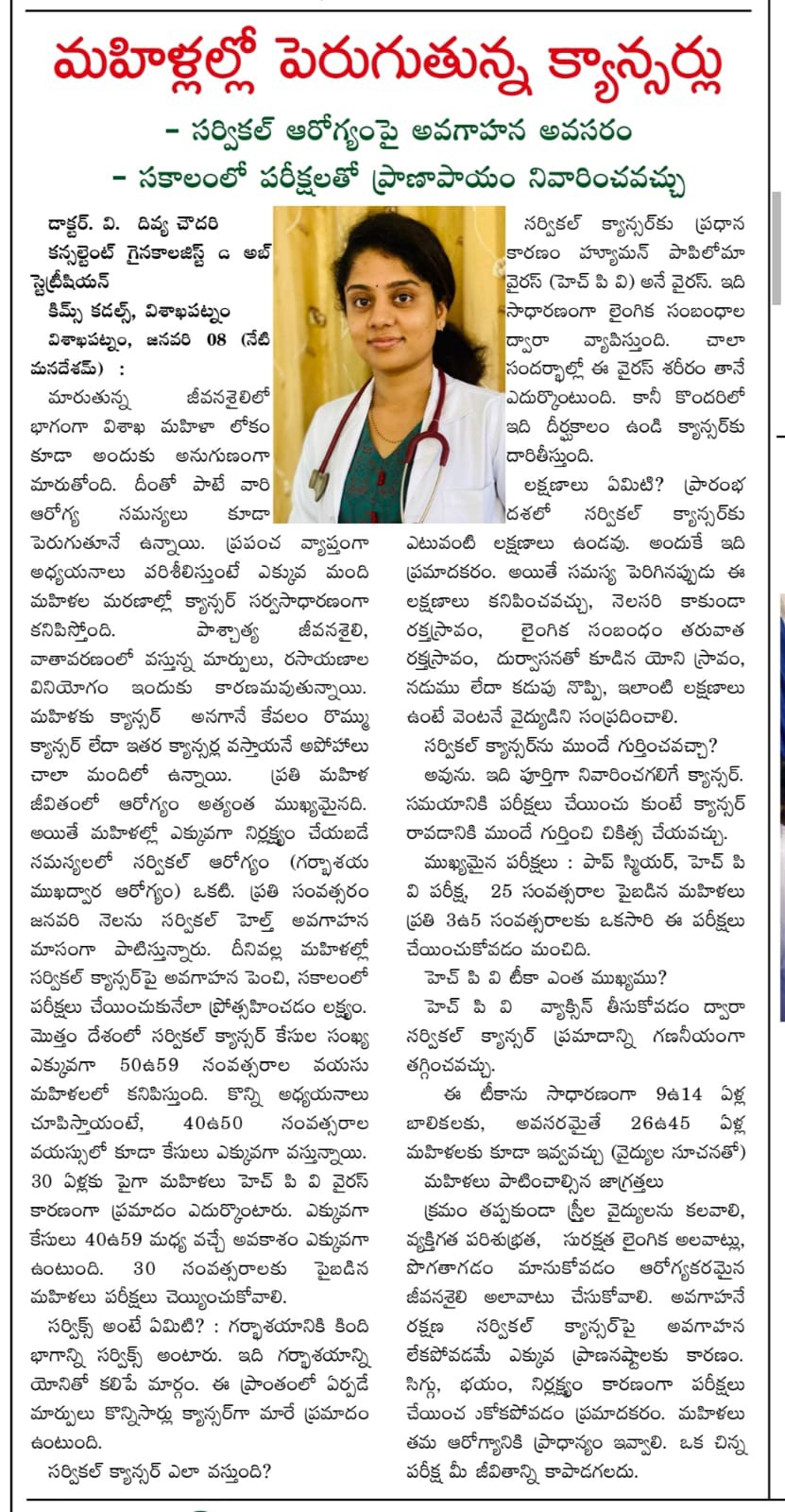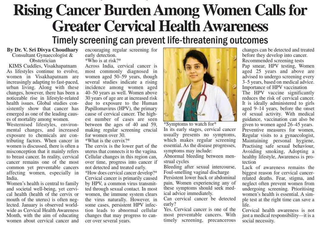 🩺 Dr. V. Sri Divya Chowdary, Consultant Obstetrician & Gynaecologist at KIMS Cuddles, Sheela Nagar, stresses that cervical health is frequently neglected, even though women’s health forms the backbone of family and societal well-being.