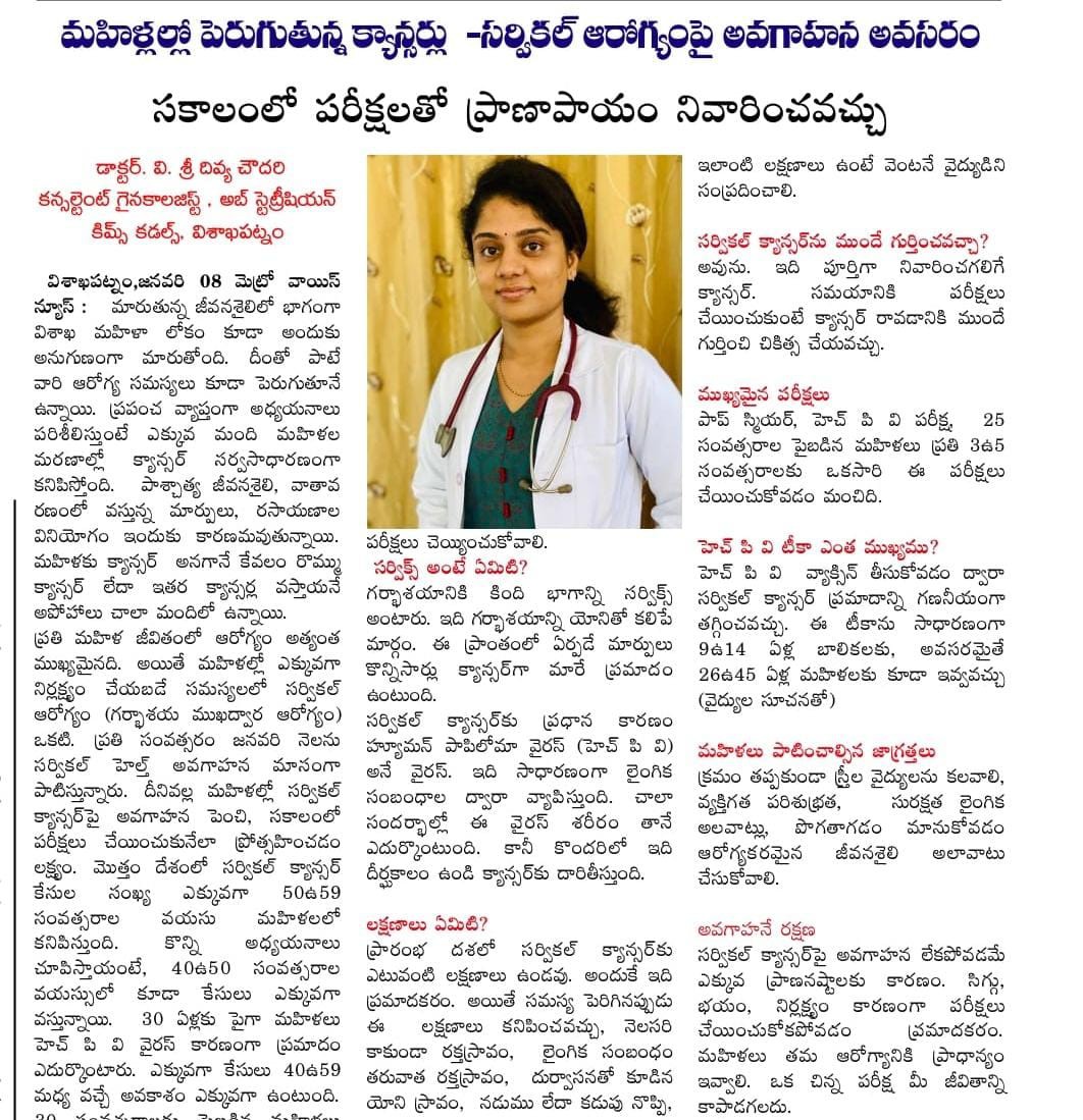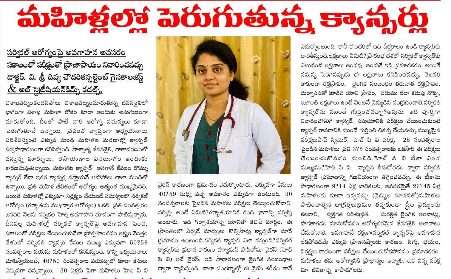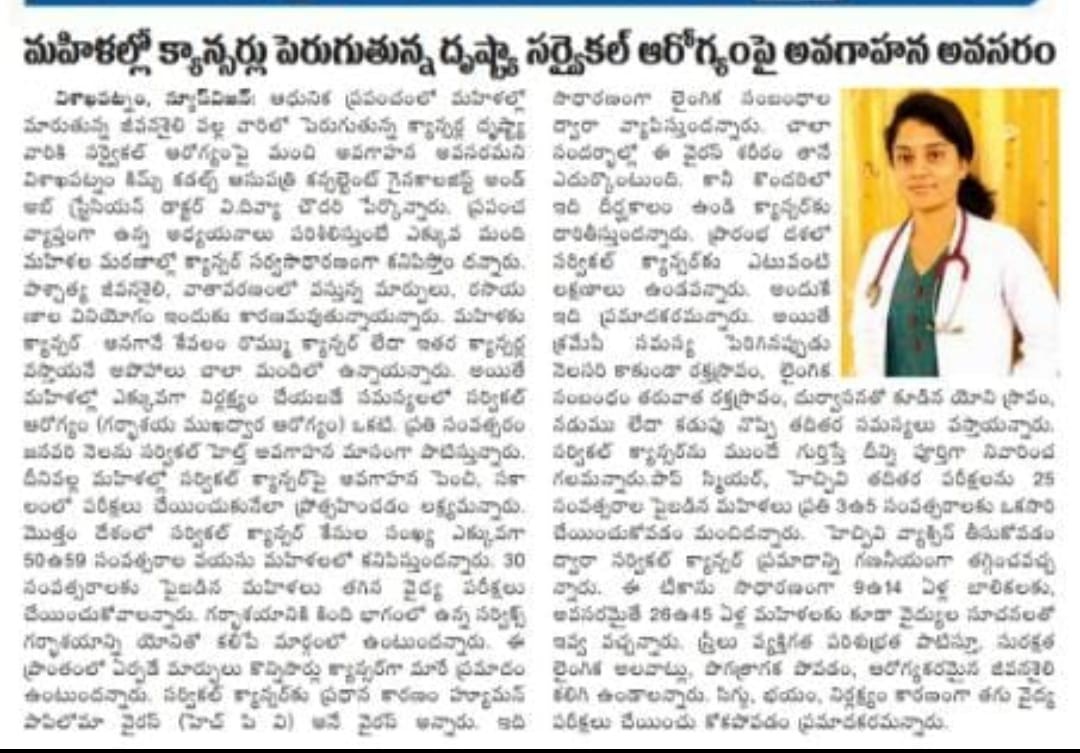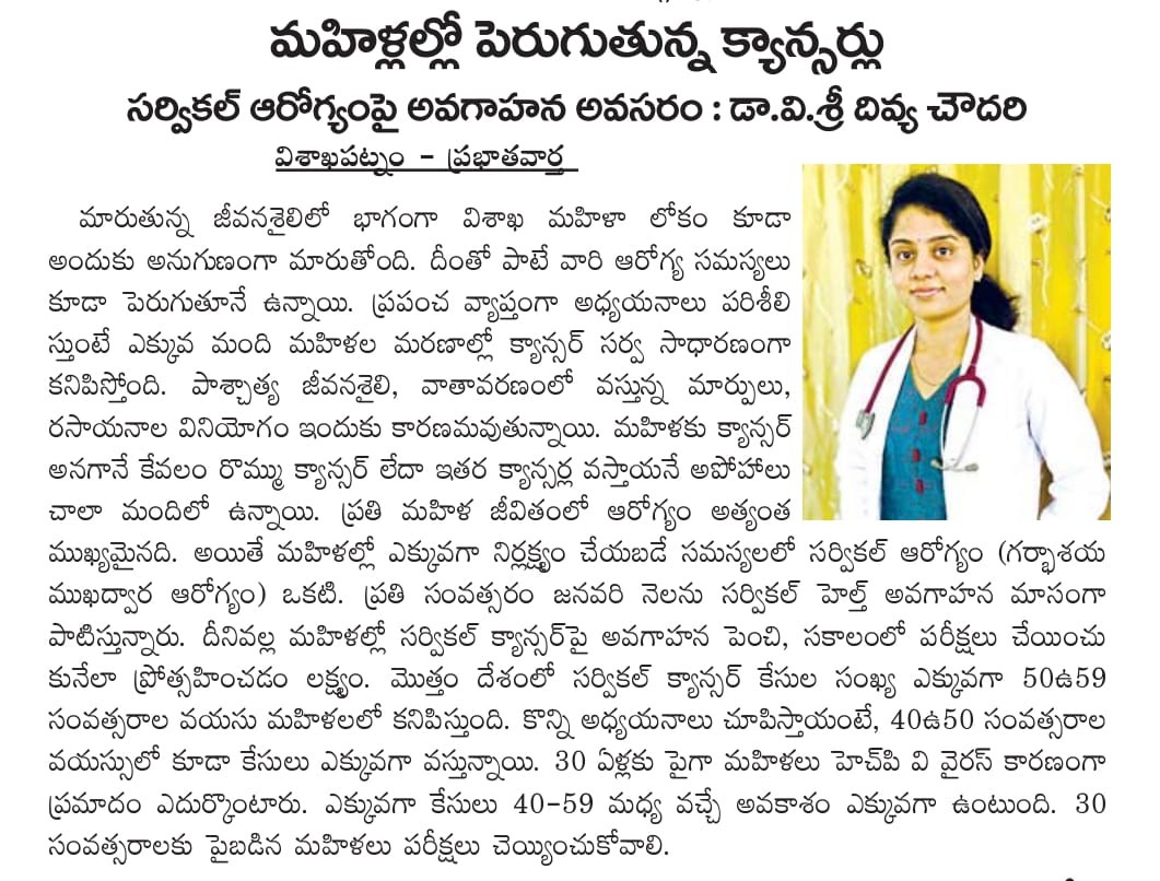 🩺 Dr. V. Sri Divya Chowdary, Consultant Obstetrician & Gynaecologist at KIMS Cuddles, Sheela Nagar, stresses that cervical health is frequently neglected, even though women’s health forms the backbone of family and societal well-being.